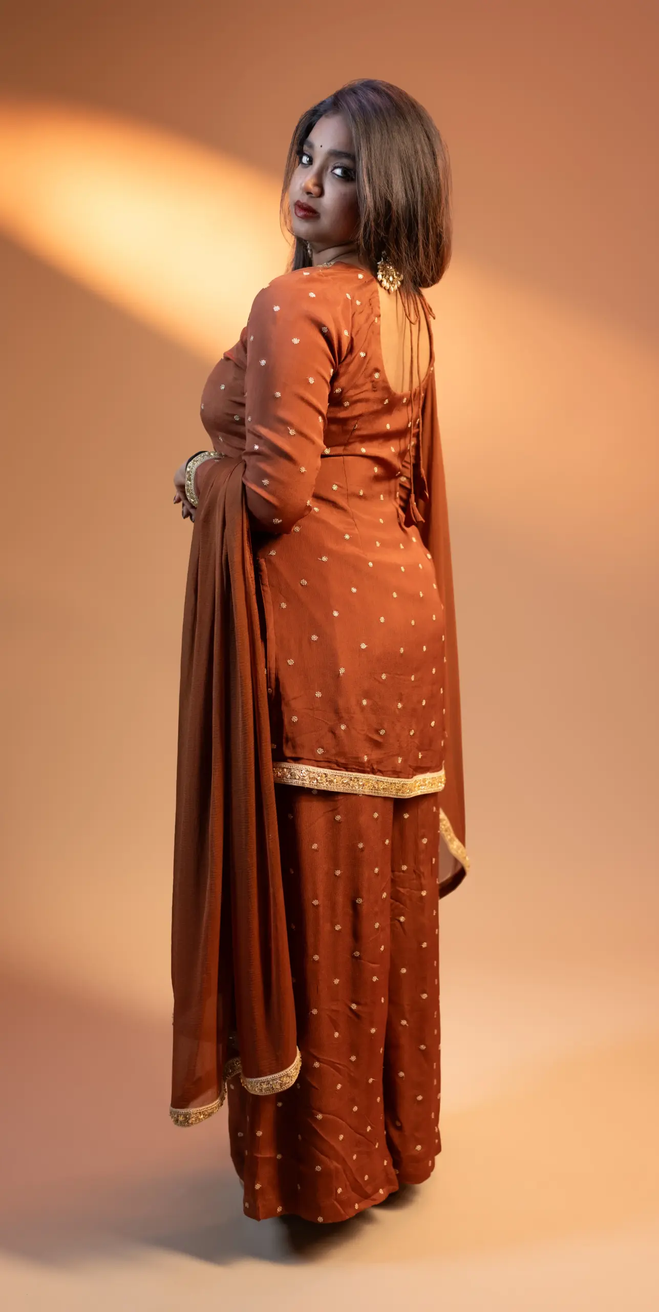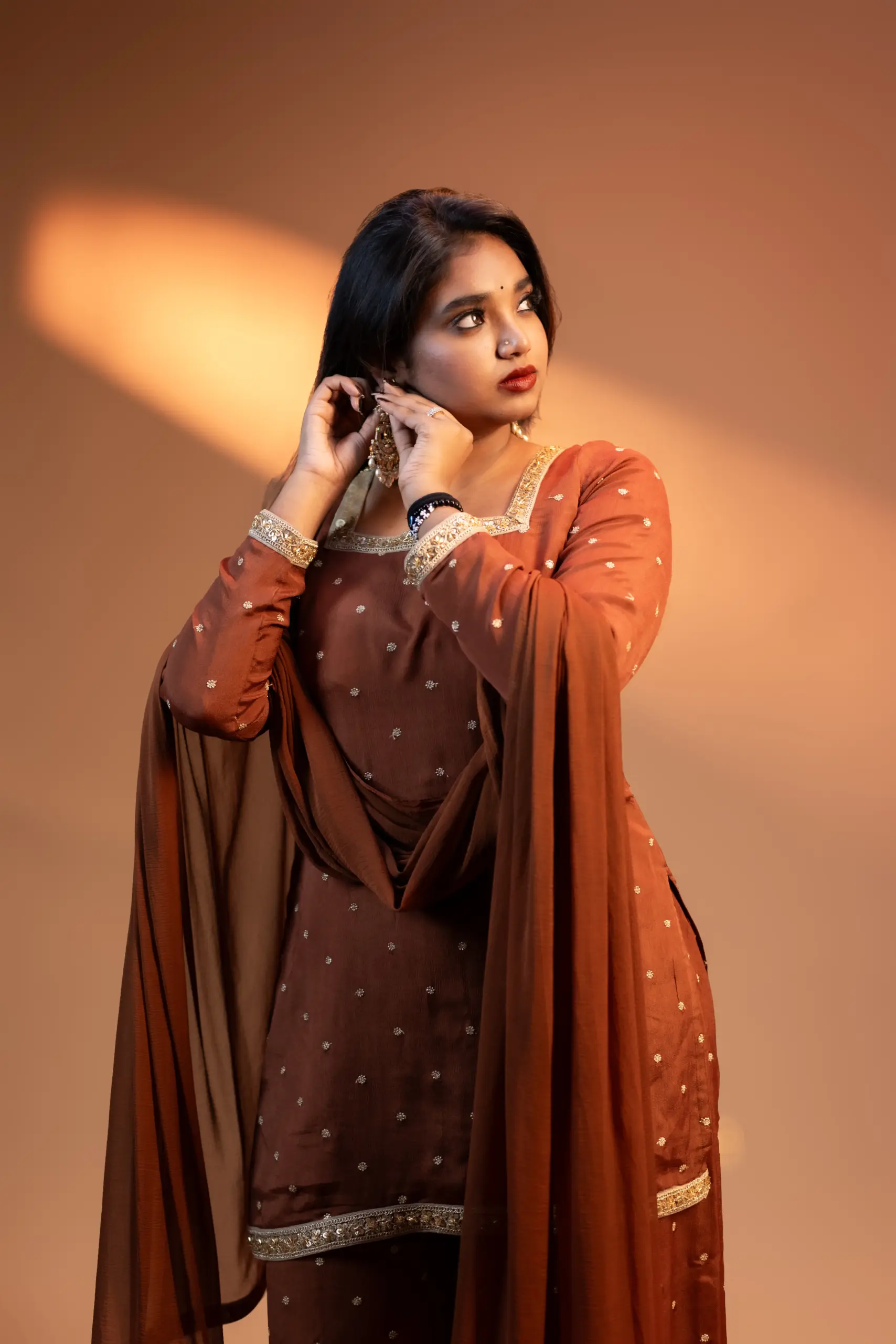 Karnikar Brown – Kurta Set Elegant in its simplicity, the Karnikar Brown Cord Set celebrates refined minimalism through delicate micro floral prints scattered gracefully across a rich brown base. Crafted in lightweight chiffon fabric, the ensemble carries a soft sheen that enhances its understated charm. The subtle floral detailing adds a touch of quiet sophistication, while the clean silhouette keeps the look modern and effortlessly graceful. Paired with a flowing dupatta and thoughtfully finished borders, the set brings together minimal design and timeless elegance. Chic, versatile, and refined, the Karnikar Brown Cord Set is perfect for intimate gatherings, festive evenings, and occasions where subtle detailing makes a lasting impression.